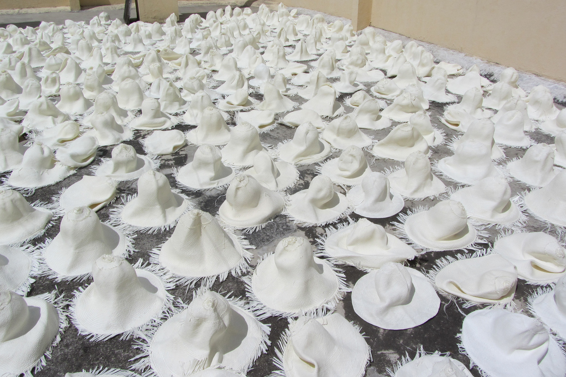 The greatest weavers work only by the light of the moon or when the sky is overcast. Constantly dipping their sharp pointed fingers in water, they split the fibre razor thin, and with all the virtuosity of a spinning wheel, plait ring after ring of palm into fabric so soft and dense that it equals silk. The hats are then pummelled, trimmed, groomed, scrubbed and branded with "fabricado en Ecuador".